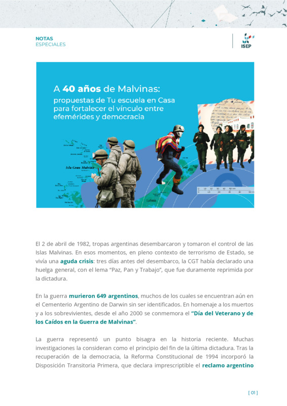 Orlandi, María ElizabethGonzález Brizuela, Francisco | A 40 años de la Guerra de Malvinas se presentan tres propuestas didácticas del Programa Tu Escuela en Casa para Primaria y Secundaria que reflexionan sobre la historia desde una nueva agenda de derechos. |