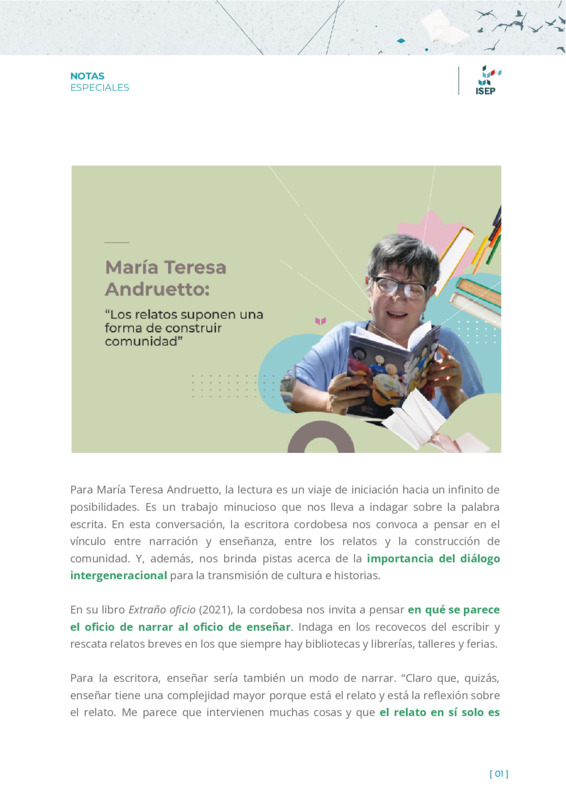 Orlandi, María ElizabethTonti, Danilo | María Teresa Andruetto nos convoca a pensar en el vínculo entre narración y enseñanza, entre los relatos y la construcción de comunidad. Además, nos brinda pistas acerca de la importancia del diálogo intergeneracional para la transmisión de cultura e historias. |