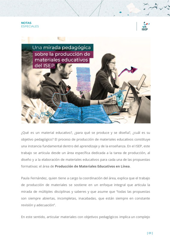 Militich, MicaelaGonzález Meloni, JulietaTonti, Danilo | Este artículo aborda el proceso de producción de materiales educativos que constituye una instancia fundamental dentro del aprendizaje y de la enseñanza. En el ISEP, este trabajo se articula desde un área específica dedicada a la tarea de producción, al diseño y a la elaboración de materiales educativos para cada una de las propuestas formativas: el área de Producción de Materiales Educativos en Línea. En esta nota,se explica el trabajo de producción de materiales sostenido en un enfoque integral que articula la mirada de múltiples disciplinas y saberes y que asume que “todas las propuestas son siempre abiertas, incompletas, inacabadas, que están siempre en constante revisión y adecuación”. |