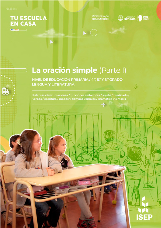 Agüero, NoeliaDaveloza, ValeriaDoria, NoeliaYepes, Silvia | "La oración simple (Parte II)" es una actividad modular de Tu Escuela en Casa destinada a 6.º grado de nivel Primario. La propuesta se estructura sobre el eje de Lengua y Literatura, desde el cual se trabaja la oración simple, los elementos que la componentes así como los constituyentes oracionales: sus funciones en términos de informatimatividad. El primer momento de trabajo aborda el orden lógico de la oración y los complementos del sujeto. El segundo momento se trabaja el predicado y los complementos circunstanciales del verbo. En el tercer momento se propone crear oraciones con un orden divertido, raro, poético o como más guste, agregando información al sujeto o al predicado. |