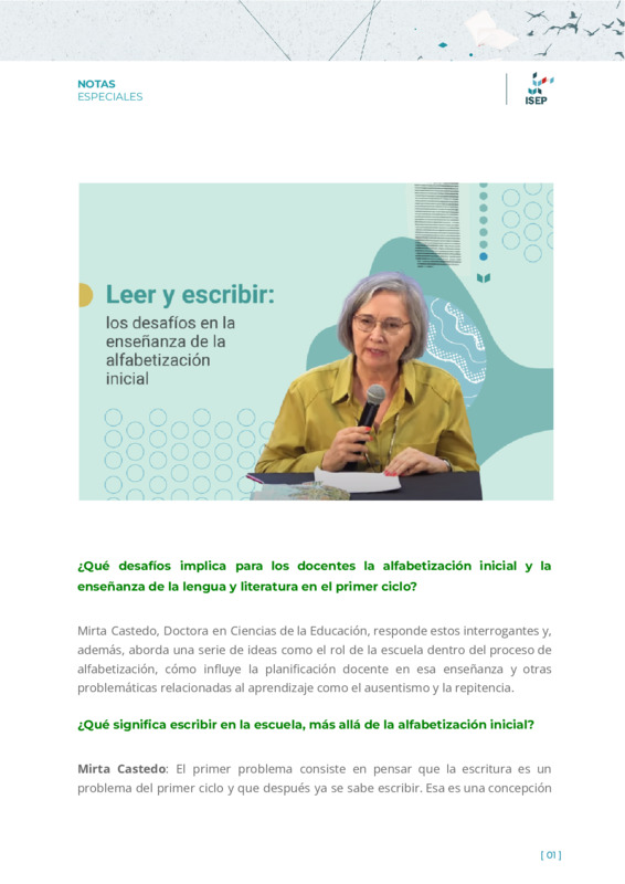 Militich, MicaelaGonzález Meloni, Julieta | Mirta Castedo aborda ideas como el rol de la escuela dentro del proceso de alfabetización, cómo influye la planificación docente en esa enseñanza y otras problemáticas relacionadas al aprendizaje como el ausentismo y la repitencia. |