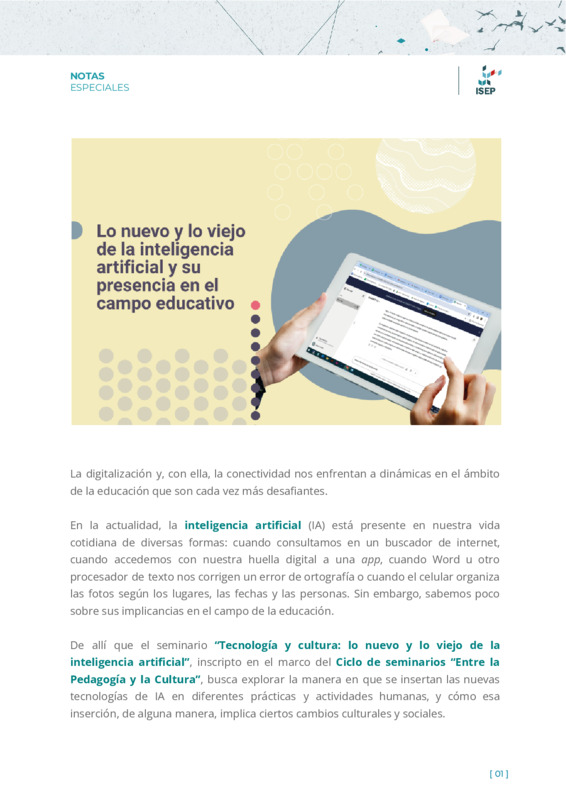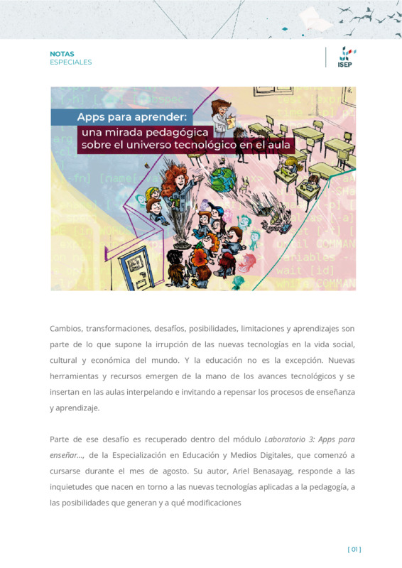 Militich, MicaelaGonzález Meloni, Julieta | Este artículo explora las inquietudes que nacen en torno a las nuevas tecnologías aplicadas a la pedagogía, a las posibilidades que generan y a qué modificaciones implican en la tarea diaria del docente. Además, aborda las nuevas herramientas y recursos que emergen de la mano de los avances tecnológicos y se insertan en las aulas interpelando e invitando a repensar los procesos de enseñanza y aprendizaje. La nota es producida en el marco del módulo Laboratorio 3: Apps para enseñar, de la Especialización en Educación y Medios Digitales, que se ofrece desde el Instituto Superior de Estudios Pedagógicos (ISEP). |