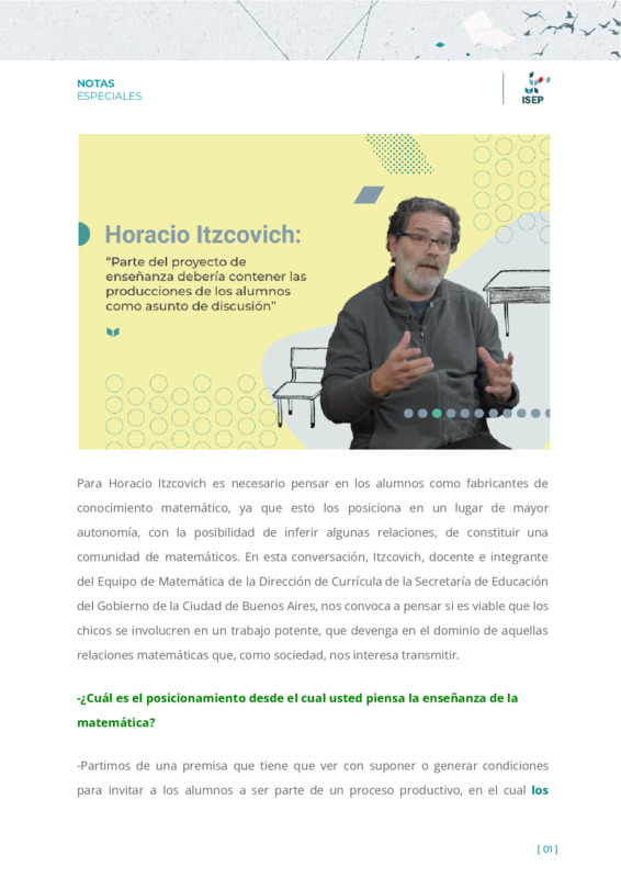 Orlandi, María ElizabethGonzález Meloni, Julieta | Horacio Itzcovich reflexiona sobre los desafíos que debe afrontar el docente al momento de enseñar Matemática. Nos convoca a pensar si es viable que los chicos se involucren en un trabajo potente, que devenga en el dominio de aquellas relaciones matemáticas que, como sociedad, nos interesa transmitir. |