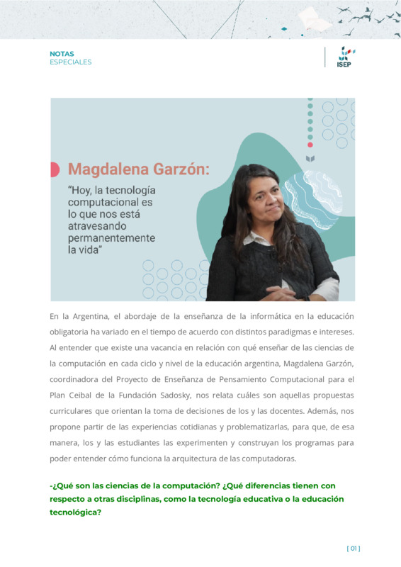 Orlandi, María ElizabethGonzález Meloni, JulietaTonti, Danilo | Magdalena Garzón, coordinadora del Proyecto de Enseñanza de Pensamiento Computacional para el Plan Ceibal de la Fundación Sadosky, relata cuáles son aquellas propuestas curriculares que orientan la toma de decisiones de los y las docentes. Además, propone partir de las experiencias cotidianas y problematizarlas, para que, de esa manera, los y las estudiantes las experimenten y construyan los programas para poder entender cómo funciona la arquitectura de las computadoras. |