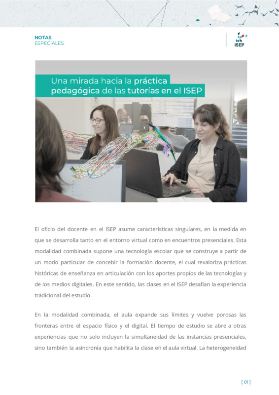 Militich, MicaelaGonzález Meloni, Julieta | Esta nota aborda las figuras centrales de los docentes-tutores, pensadas en un rol que acompaña y que entrama un diálogo pedagógico en el marco de una modalidad combinada, de cada propuesta de formación que ofrece el ISEP, y que pone en movimiento un dispositivo pedagógico que articula la experiencia de cursado y cuida la calidad en todas sus dimensiones. Además, se explora el oficio del docente en el ISEP que asume características singulares, en la medida en que se desarrolla tanto en el entorno virtual como en encuentros presenciales. La modalidad combinada supone una tecnología escolar que se construye a partir de un modo particular de concebir la formación docente, el cual revaloriza prácticas históricas de enseñanza en articulación con los aportes propios de las tecnologías y de los medios digitales. |