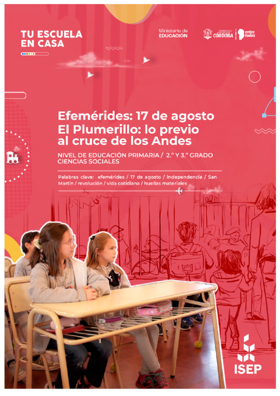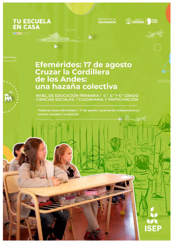 Lamelas, GabrielaMoyano, EstelaPedrazzani, CarlaRamallo, Sabrina | "Efemérides: 17 de Agosto. Cruzar la Cordillera de los Andes: una hazaña colectiva" es una secuencia didáctica de Tu Escuela en Casa destinada a 4.º, 5.º y 6.º grado de nivel Primario. Consiste en una propuesta que integra contenidos y aprendizajes de los diversos ejes curriculares de las Ciencias Sociales del nivel. La secuencia se centra en abordar la complejidad de la lucha por la independencia y el cruce de los Andes como una construcción colectiva a partir de la estrategia de San Martín. Las diferentes actividades ofrecen la posibilidad de que los niños y niñas identifiquen actores sociales, sus intereses y conflictos y pone a su disposición diferentes recursos e imágenes para reconocer el espacio cordillerano para analizar las dificultades que implicó el desafío de su cruce con el ejército. |