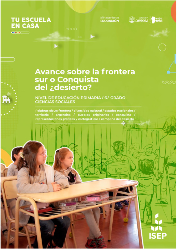 Lamelas, GabrielaMoyano, EstelaRamallo, Sabrina | "Avance sobre la frontera sur o conquista del ¿desierto?" es una secuencia didáctica de Tu Escuela en Casa destinada a 6.° grado de nivel Primario. Consiste en una propuesta que integra ejes del campo de las Ciencias Sociales. La secuencia se centra en el reconocimiento de los principales conflictos y acuerdos llevados a cabo en el periodo de 1853 - 1880 en torno a la organización del Estado nacional además del análisis y reconocimientos de las políticas e intereses impulsados durante la segunda mitad del siglo XIX y comienzos del XX para favorecer la economía agraria. Las diferentes actividades ofrecen la posibilidad de que los niños y niñas logren observar, comparar e interpretar los cambios en mapas del estado nacional a lo largo de esta época, reconociendo actores sociales, momentos históricos, detalles descritos, entre otros. Se busca mediante la lectura, análisis de imágenes e instancias lúdicas que los y las estudiantes exploren y analicen diversas fuentes de información, actores y situaciones diversas en torno a la campaña del desierto como acción militar. |