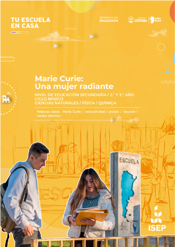 Martínez, María Soledad | "Marie Curie, una mujer radiante" es una secuencia didáctica de Tu Escuela en Casa destinada a 2.º y 3.º año del Ciclo Básico de nivel Secundario. Consiste en una propuesta que integra saberes de los espacios curriculares de Física y Química. La secuencia recupera los inmensos aportes que las mujeres han hecho a la actividad científica, más precisamente los de Marie Curie. Las distintas actividades ofrecen la posibilidad de que las y los estudiantes conozcan más acerca de la vida de esta científica y de la radiactividad, uno de sus descubrimientos. |