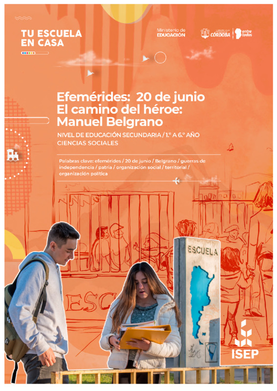 Gencarelli, CandelaMoyano, Estela | "El camino del héroe: Manuel Belgrano" es una secuencia didáctica de Tu Escuela en Casa destinada a 1.º, 2.º y 3.º año del Ciclo Básico de nivel Secundario. Consiste en una propuesta que integra el campo de Ciencias Sociales e Historia. La secuencia se centra en la explicación de los procesos revolucionarios de América Latina y el Río de la Plata, organizando la información a través de diversos procedimientos que incluyen fortalecer la habilidad de análisis crítico de diversas fuentes y la comunicación en diferentes registros, además de construir y emitir opiniones argumentadas sobre problemáticas socioculturales de la sociedad argentina en general y su repercusión en la propia comunidad. Las diferentes actividades ofrecen la posibilidad de que las y los adolescentes logren aproximarse a la figura de Manuel Belgrano propiciando el interés y las reflexiones críticas a propósito de nuestra historia. Todo el recorrido de historia e información sobre nuestro prócer llega a los y las alumnas en diferentes recursos audiovisuales como podcast, fotografías, etc. La secuencia finaliza con un proceso de creación de una bandera por parte de las y los estudiantes. |