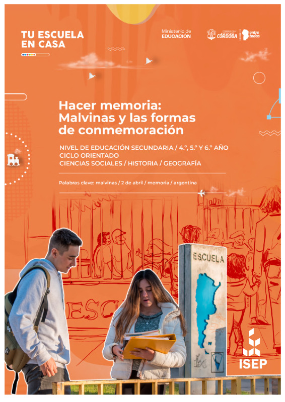 Moyano, EstelaPedrazzani, Carla | "Efemérides: 2 de Abril. Hacer memoria: Malvinas y las formas de conmemoración" es una secuencia didáctica de Tu Escuela en Casa destinada a 4.°, 5.° y 6.° año de nivel Secundario. Consiste en una propuesta que integra contenidos y aprendizajes de Historia y Geografía. La secuencia se centra en el trabajo metodológico sobre la memoria histórica a partir de un tema complejo y conflictivo como Malvinas, memorias y olvidos sobre la guerra y los múltiples sentidos de su conmemoración. En ese marco, el reconocimiento de la presencia de mujeres en la guerra se aborda como un aspecto olvidado/negado en el conflicto bélico. Las diferentes actividades ofrecen la posibilidad de que los y las jóvenes realicen un mapeo de las formas de conmemoración a lo largo del país y una reflexión crítica sobre la memoria histórica y los actores sociales olvidados o negados por la historia. |