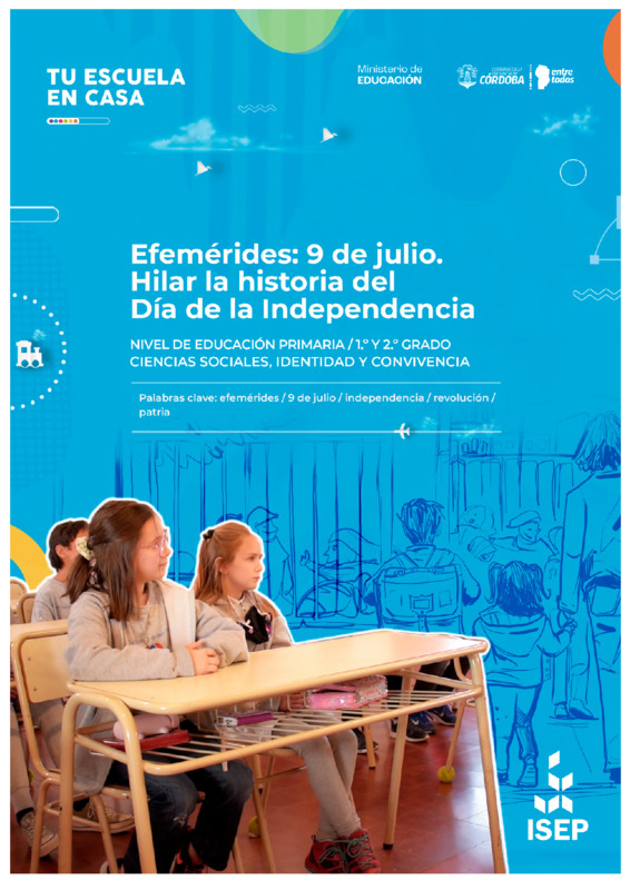 Moyano, EstelaPedrazzani, CarlaRamallo, Sabrina | "Efemérides: 9 de Julio. Hilar la historia del Día de la Independencia" es una secuencia didáctica de Tu Escuela en Casa destinada a 1.º, 2.º grado de nivel Primario. Consiste en una propuesta que integra contenidos y aprendizajes del eje curricular “Las sociedades a través del tiempo" y de “Identidad y convivencia”. La secuencia, a partir del trabajo con la vida cotidiana, se centra en afianzar la importancia de la Declaración de Independencia en el contexto de la revolución iniciada en 1810 y la guerra y los conflictos políticos, sociales y económicos que se desarrollaron con ellas. Las diferentes actividades ofrecen la posibilidad de que los niños y niñas consoliden conceptos vinculados a esta etapa y trabajen con las diversas prácticas y conmemoraciones populares que se originaron en ese período. |